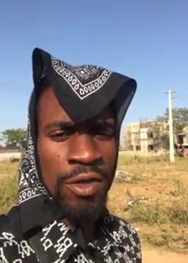 A man wearing a black and white patterned shirt and a black bandana is standing in a grassy field. In the background, there is a building under construction and some trees. The man is pointing at the camera and speaking. The sky is blue.