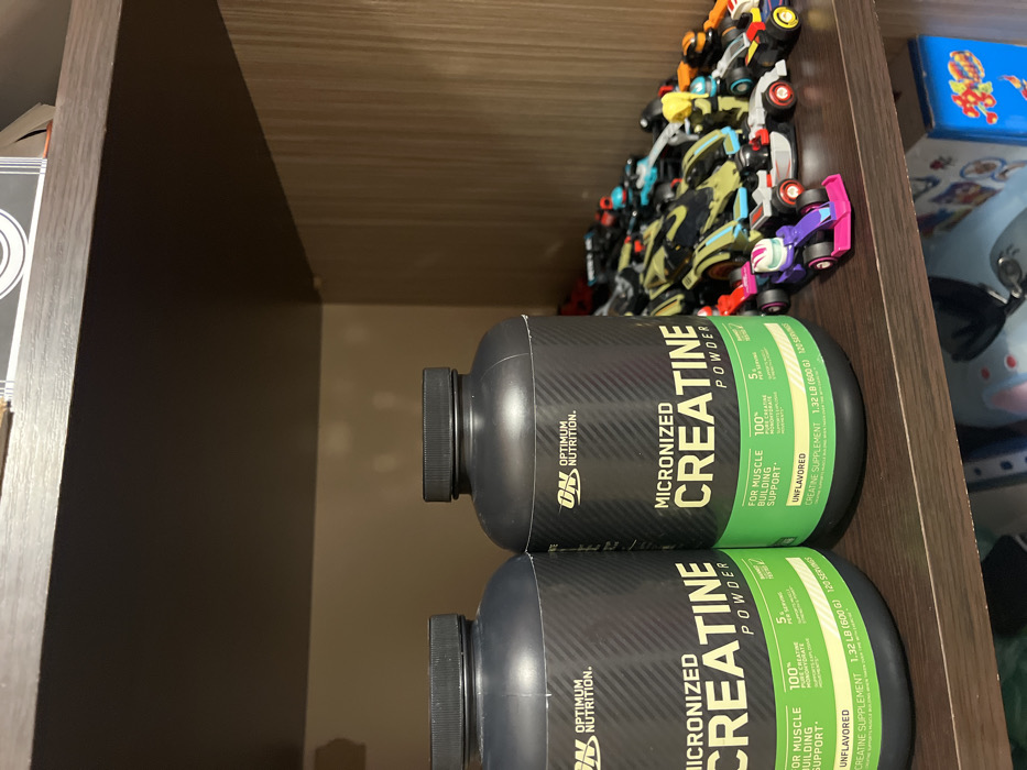 The image displays an indoor wooden shelving unit. On a dark wood shelf, two black plastic tubs of "Optimum Nutrition Micronized Creatine Powder" are centrally positioned. Both tubs feature green labels stating "UNFLAVORED" and "1.32 LB (600 G) / 120 SERVINGS." To the right of the tubs, a collection of multi-colored toy race cars, including a distinct purple and pink formula car in the foreground, are arranged on the same shelf. The shelving unit features a dark wooden back panel and a lighter wood-grained side panel on the right. A dark wooden shelf is visible above the displayed items, appearing empty. A portion of another shelf containing indistinct objects is partially visible below. No individuals are present, and no actions or interactions are depicted. The specific location in Yerevan, Armenia, cannot be determined from the visual information provided.