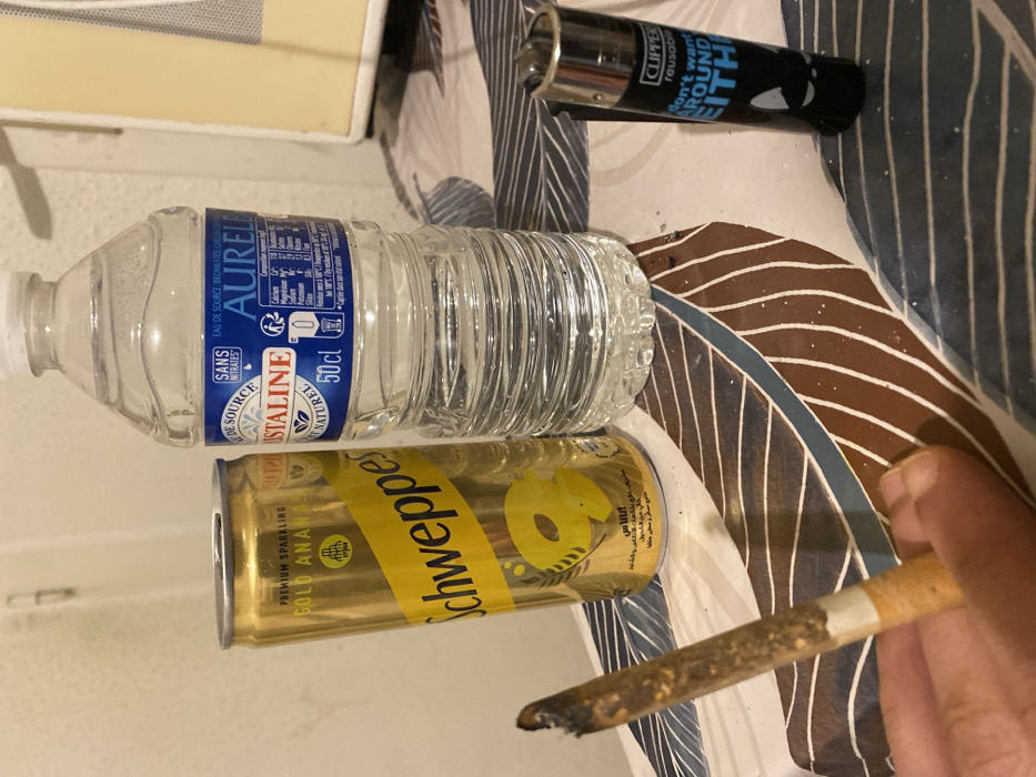 An overhead shot displays a table with several items: a clear plastic water bottle labeled "Cristaline Aurel," a golden Schweppes can, a black Clipper lighter, and a hand holding a lit joint