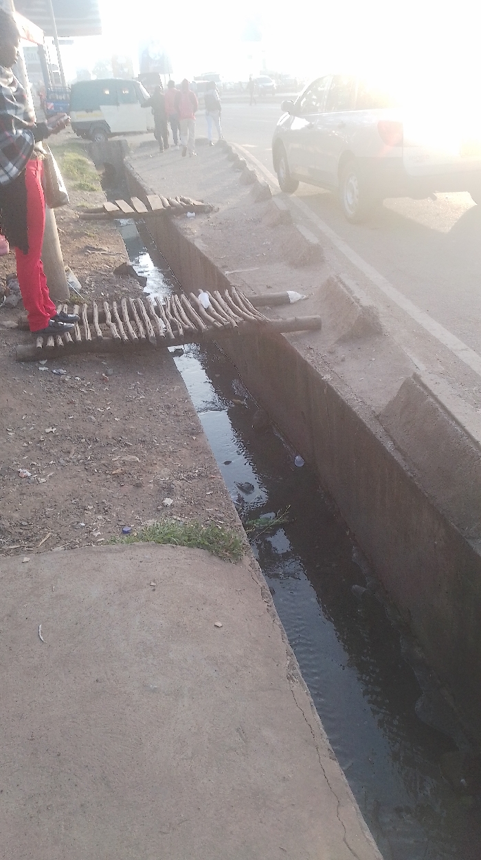 The image depicts an urban street scene in Nairobi, Kenya, under bright, low-angle sunlight causing significant glare on the right. In the foreground, a concrete sidewalk transitions to a dirt path, which runs parallel to a concrete-lined drainage ditch. This ditch, containing dark water and visible refuse (including plastic bottles), separates the pedestrian area from an asphalt road. Two makeshift footbridges, constructed from multiple wooden poles, span the drainage ditch. One is in the mid-ground, connecting the dirt path to the concrete sidewalk, while another is further along, connecting to the roadside. On the left, a person is standing on the dirt path, partially obscured, wearing red trousers and a plaid-patterned garment. Their feet are near the first wooden bridge. In the mid-ground, a group of approximately 4-5 individuals walk along the dirt path beside the road; one person is notably wearing a red hooded jacket. A light-colored minibus (matatu) with a yellow stripe is visible further down the street on the left. On the right, a silver or light-colored sedan is positioned on the asphalt road, heavily affected by sun glare. The background shows indistinct buildings and a hazy sky. The environment is characterized by a mix of paved and unpaved surfaces, an open drainage system, and active pedestrian and vehicular traffic.