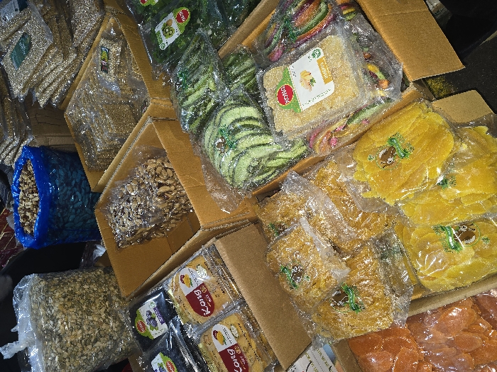- "The image depicts a close-up, overhead view of a market stall or shop in the city of Yalangach, Uzbekistan, featuring a dense arrangement of various packaged food items, primarily dried fruits and nuts" by FM-ffoK62, licensed under CC BY 4.0