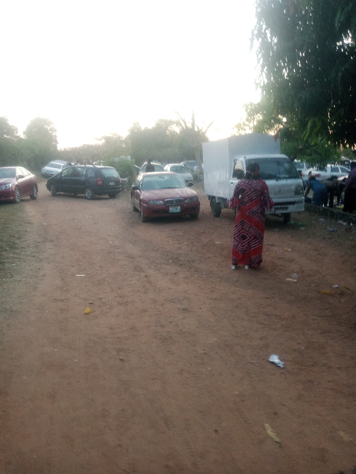 An open dirt lot features multiple parked vehicles, including cars and a box truck. A woman in a red and patterned dress stands in the foreground, facing away. Other individuals are visible in the background. Trees surround the lot, and the sky is bright, suggesting it's either early morning or late afternoon. Debris is scattered on the ground.