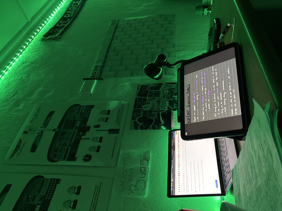This image depicts a study space located in Port Alfred, South Africa. The room is illuminated by green LED strip lighting mounted along the top of a light-colored, textured wall. On the wall, from left to right, are two "AIR SCHOOL" posters, one detailing a "Piper Cherokee Archer II / III" cockpit diagram. Below these, a transparent sheet with "Welcome Back Bugs" handwritten in green is affixed. Further right, an "FC BARCELONA" scarf is draped horizontally, and a large "2026" planner poster is visible. Below the planner, another poster titled "Vision Board 2026" is present. A dark desk occupies the foreground. On the left, a silver laptop is open, displaying an online interface with text and colored indicators. To its right, a dark-cased tablet stands upright, showcasing handwritten notes titled "VDF (VHF Direction Finder)". A stack of papers with writing is situated in front of the laptop. To the right of the tablet, a black pen or stylus lies on the desk. A black flexible desk lamp, emitting a green light, is positioned on the far right of the desk. A clear water bottle or container is visible behind the laptop and tablet.