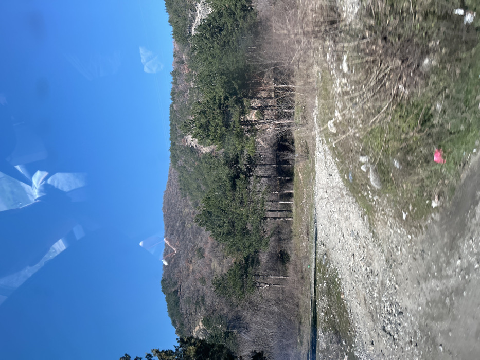 The image depicts a rural, mountainous landscape located in Vetren Dol, Bulgaria, captured on a clear, sunny day. The scene is viewed through a window, evident from prominent reflections in the upper sky portion. The background features a large hill or mountain, its upper half sparsely covered with bare deciduous trees and brownish-gray ground. A distinct, dense band of dark green coniferous trees, primarily pines, stretches horizontally across the mountain's mid-section. Sections of lighter gray, rocky terrain or scree are visible on the right side of the mountain. Faint, dark lines, consistent with power lines, traverse the upper mountain slopes. In the mid-ground, a linear formation of approximately eight tall, slender coniferous trees stands prominently. Behind these, additional bare deciduous trees and brush are present. To the right of the tree line, the ground is covered with dense, dry, brown vegetation. The foreground consists of an unpaved, light-colored gravel and rock path or track, angling from the lower-left towards the middle-right. Sparse patches of green grass and dry, brownish weeds grow along the path's edges. Several small pieces of litter are visible on the ground, including a bright pink item in the lower-right quadrant. The sky is a uniform, clear blue. Overlaying the sky are several reflections: a prominent, abstract, bright white and reddish-orange reflection in the upper-center, displaying a symmetrical, multi-pronged shape; and a fainter, diffuse reflection in the upper-right. No individuals are depicted in the natural landscape.