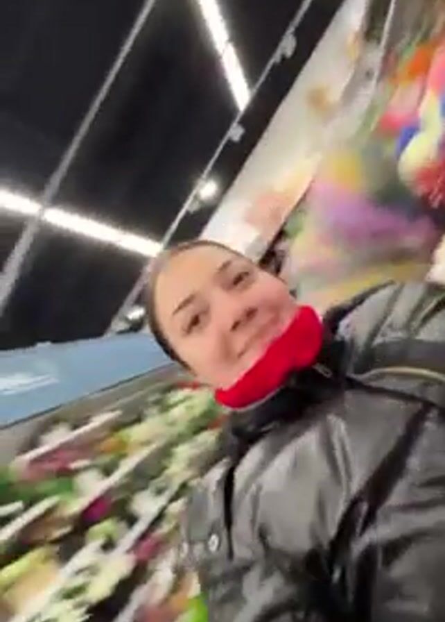 A young woman with brown hair pulled back in a bun, wearing a black puffer jacket and a red turtleneck, films herself in a store. She is standing next to a display of fake flowers in various colors. She looks at the camera and smiles slightly. The lighting is bright and artificial. The store seems well-stocked.