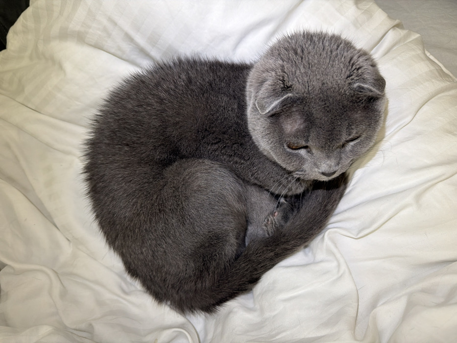The scene is located indoors in Voronezh, Russia. A single domestic cat, exhibiting solid gray fur consistent with a British Shorthair or Scottish Fold breed due to its visible folded ears, is the sole subject. The cat is tightly curled into a resting position on a white, wrinkled textile surface, likely bedding such as a sheet or duvet cover. Its eyes are closed, indicating sleep or deep repose, with its head tucked close to its body and its tail wrapped around its hindquarters. The white bedding shows faint striped patterns and a few minor, dark specks consistent with lint. No other subjects or significant objects are present, and no interactions are depicted. Illumination appears to be from an artificial light source.