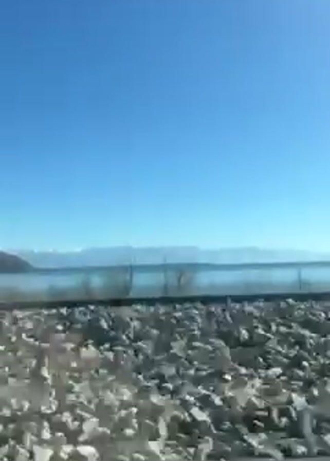view from a train moving past a lake. The sky is blue. There is a layer of grey rocks along the side of the train tracks. The water in the lake is calm and a light blue-grey color. In the distance across the lake, there is a row of mountains. Some trees are visible near the edge of the lake. The camera is shaking a bit as the train moves. There is music playing in the background.