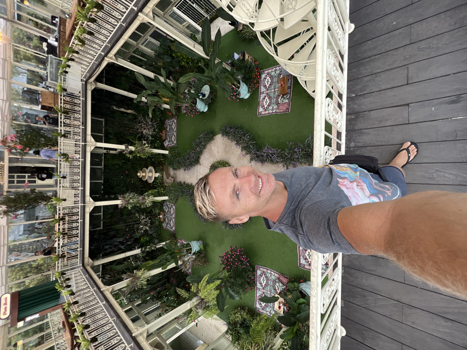 A man takes a selfie in a greenhouse. He stands on a wooden deck, with a spiral staircase in the background. The greenhouse is filled with lush greenery, including plants and flowers. Small rugs adorn the floor. A water fountain sits in the middle. The greenhouse has a white frame and glass walls.