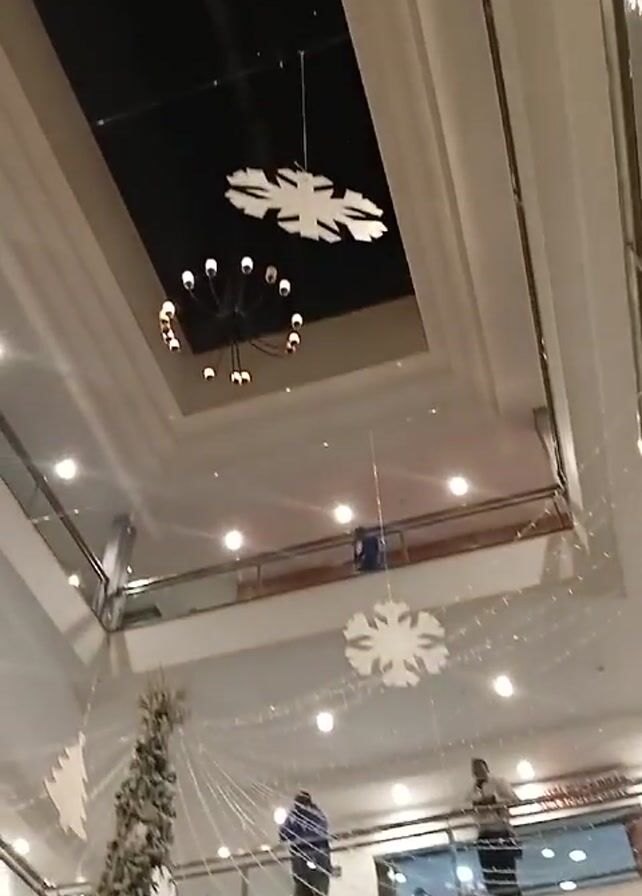 interior of a shopping mall decorated for Christmas. The camera pans down from the ceiling, revealing a large Christmas tree in the center of the mall. People are walking around the tree, some of them children. There is a small group of people gathered near the base of the tree. The mall is brightly lit with overhead lights and decorated with snowflake ornaments. A woman in a white jacket walks past the camera. The mall appears to be busy.