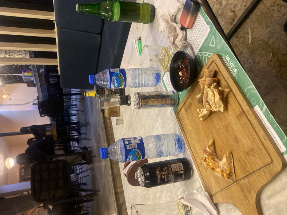 A table is scattered with various items. There's a wooden cutting board holding bread and a pizza slice, next to a bowl with a dark liquid. Two water bottles, a green glass bottle, and two aluminum cans are lined up. A vape pen, a lighter, and two glasses sit among the items. The scene appears to be a casual, messy gathering at a cafe or bar, with people seated in the background.
