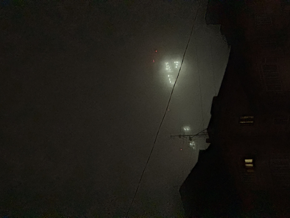 A nighttime scene shows a dark, partially silhouetted building on the right. A utility pole wire stretches across the frame diagonally. In the foggy background, a structure with multiple lights is faintly visible, likely a tall tower or building. Another, smaller structure is also visible behind it, possibly a crane. The scene is low-lit and shrouded in fog, creating a slightly eerie atmosphere.