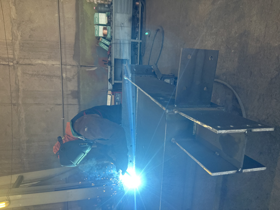 An individual is depicted in an indoor industrial workshop, engaged in arc welding on a large, dark-colored fabricated steel structure