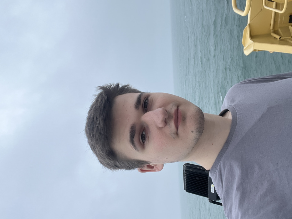 A young adult male, approximately 18-25 years old, with short dark brown hair, fair skin, a prominent nose, and light facial stubble on his chin and upper lip, is depicted facing the viewer with a neutral expression. He wears a plain grey crew-neck t-shirt. The scene is outdoors on what appears to be a vessel or platform at sea, consistent with a coastal location such as Bangor, United Kingdom, though specific identifying landmarks are not visible. Behind the male's left shoulder, a black, rectangular industrial floodlight with a finned heat sink is mounted on a structure. To the male's right and extending into the background, a choppy, greenish-blue sea with visible waves dominates the mid-ground. The sky above is entirely overcast, a uniform light grey that blends into a hazy horizon with the sea. In the lower right corner, a section of a yellow metallic structure, possibly a railing or equipment component, is visible.