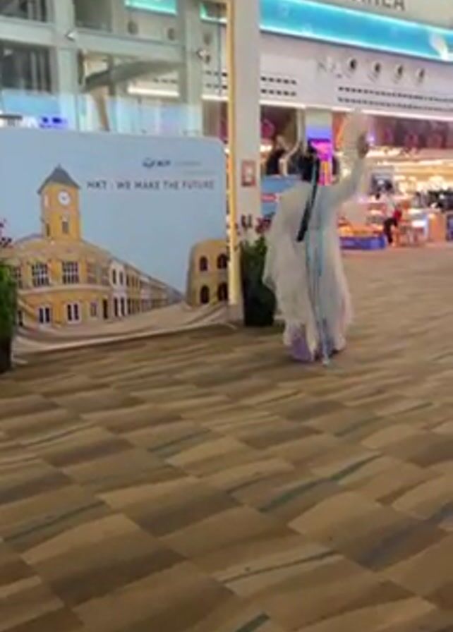 A person wearing white and purple traditional clothing is performing a choreographed dance, with a fan, in a large airport terminal. The terminal features a high ceiling with large windows allowing natural light to flood the space. In the background there is a sign reading "REST AREA" and a large banner displaying a picture of a building and the text "HKT : WE MAKE THE FUTURE". The floor is covered with a patterned carpet. The person is moving with grace and fluidity, incorporating the fan into their movements. There are other people and shops visible in the background of the terminal, suggesting that it is a public space with active foot traffic.
