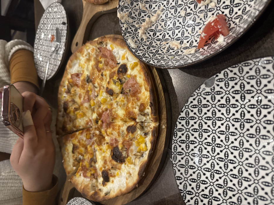 The scene depicts an indoor dining table in Bulgarovo, Bulgaria, viewed from a slightly elevated perspective. A large, round pizza, sliced into eight portions, rests on a circular wooden serving board in the center of a dark-colored table. The pizza features a golden-brown crust, melted cheese, visible corn kernels, sliced ham or similar cured meat, and dark-capped mushrooms. In the upper portion of the frame, a person's hands and forearms are visible. The individual is holding a rose-gold colored smartphone with both hands, positioned over the pizza, actively interacting with the device. The left hand wears a bandage or white wrap on one finger. The person is wearing a light-colored, possibly knitted, long-sleeved garment over a brown long-sleeved undergarment. Three ceramic plates with a distinct black and white geometric pattern are arranged around the pizza. To the upper right, an oblong plate is mostly cleared, containing a silver fork and a small red food remnant. To the lower right, a round plate or shallow bowl contains remnants of a white, creamy substance and two small slices of red tomato. To the lower left, an empty round plate with the identical black and white pattern is visible, showing a small chip on its rim. The background is dark and out of focus.