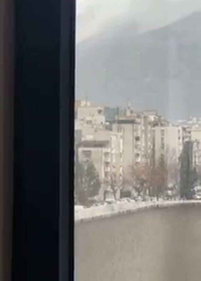 A medium shot through a window of a European cityscape on an overcast day. Several concrete apartment buildings are visible, as are trees without leaves and some cars in a parking lot. Behind the city, there is a large mountain shrouded in fog. Snow is falling lightly. The window frame is black.