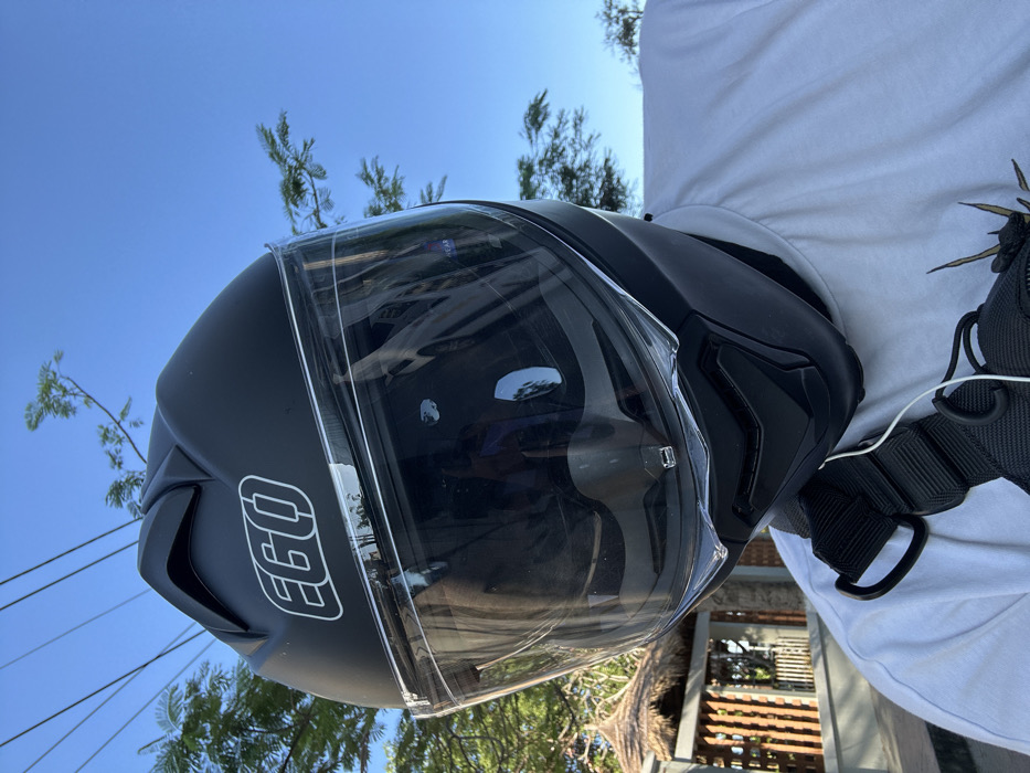A person is depicted from the chest up, wearing a black full-face motorcycle helmet with a clear visor. The helmet features a white "EGO" logo on the forehead. The clear visor reflects a light-colored vehicle, a building, and overhead utility lines. The individual wears a plain white t-shirt and a black sling bag, from which a white earbud cable extends. In the background to the left, a portion of a structure with a thatched roof and vertical supports is visible, consistent with an outdoor gazebo or a feature of a resort/restaurant. Green foliage from trees is present above and around this structure. The sky above the subject and to the right is clear and bright blue, also showing sparse tree branches and utility wires. The scene is brightly illuminated by natural daylight. This environment, characterized by tropical vegetation, thatched architecture, and clear weather conditions, is consistent with an outdoor setting in the coastal city of Nha Trang, Vietnam, possibly near a public area, resort, or roadside location.