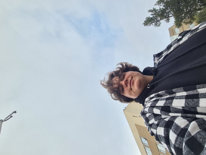 - "A person with curly brown hair poses against a cloudy sky, wearing a black hoodie and a black and white checkered flannel shirt" by FM-gCwqi1, licensed under CC BY 4.0