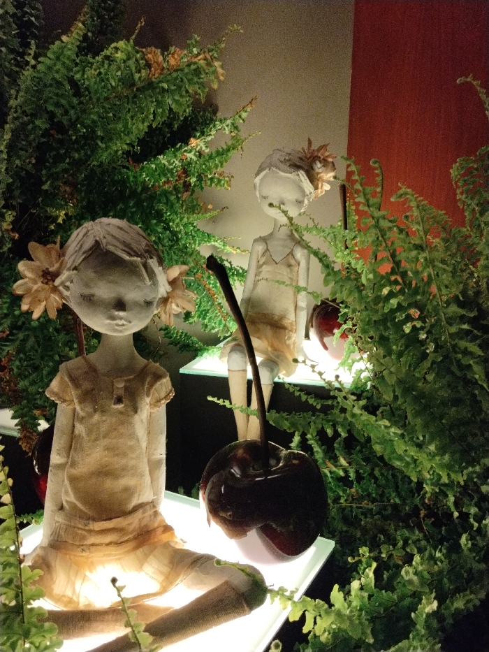 Two slender, serene-faced dolls with floral adornments are nestled amongst lush greenery. The dolls, dressed in soft, neutral-toned fabrics, sit atop illuminated glass shelves. A giant, glossy, dark cherry with a prominent stem stands in the foreground, adding a whimsical element to the scene. The background hints at warm, reddish-brown tones, contrasting with the vivid green of the foliage.