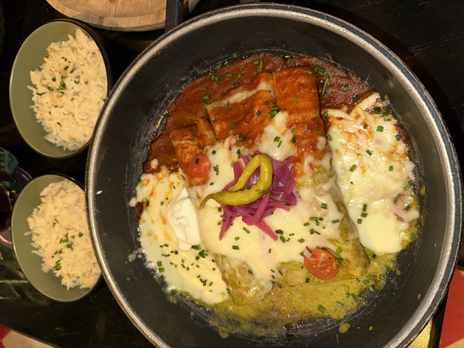 A dark grey pan, positioned centrally on a dark, reflective tabletop, contains a meal consistent with enchiladas. The dish is visually split into two distinct sauce bases: a vibrant green sauce on the left and a reddish-brown sauce on the right. Both sections are covered with melted white cheese, some areas exhibiting slight browning. A dollop of white cream is centrally placed atop the cheese. The dish is garnished with finely chopped green chives, several halved red cherry tomatoes, a curled yellow pickled pepper, and a cluster of shredded purple pickled onions, all atop the cheese layer. In the upper background, two small, light green bowls contain portions of white rice, each topped with green chives. A dark glass object is partially visible behind the bowls, and a fragment of a light-colored wooden serving board is visible on the far right. The overall lighting is dim. No individuals are depicted, and no specific actions or interactions are occurring. The scene is located in Alicante/Alacant, Spain.