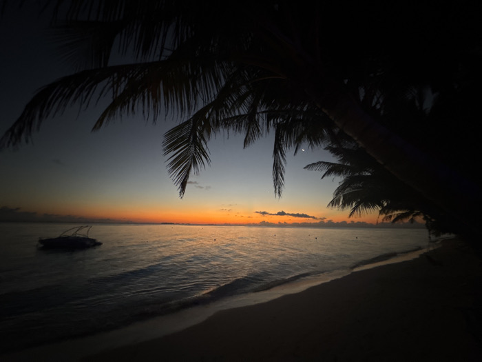 This image depicts a coastal scene at twilight, likely dawn, on Ukulhas island, Maldives. The sky exhibits a gradient from a vibrant orange band at the horizon, transitioning through amber to a dark blue-grey at the zenith. A faint crescent moon is visible in the upper right quadrant against the darker sky. Low-lying clouds are sparsely distributed above the orange horizon. The calm ocean surface reflects the sky's colors, with gentle waves breaking onto a dark sandy beach that occupies the foreground and lower right. One dark-hulled recreational boat with a discernible windshield and bow configuration is anchored or floating in the mid-left portion of the water. Several small, dark buoys are visible further out at sea. Silhouetted palm tree fronds and portions of their trunks are prominently featured in the upper and right sections of the frame, extending into the scene. No individuals or overt human activity are present.
