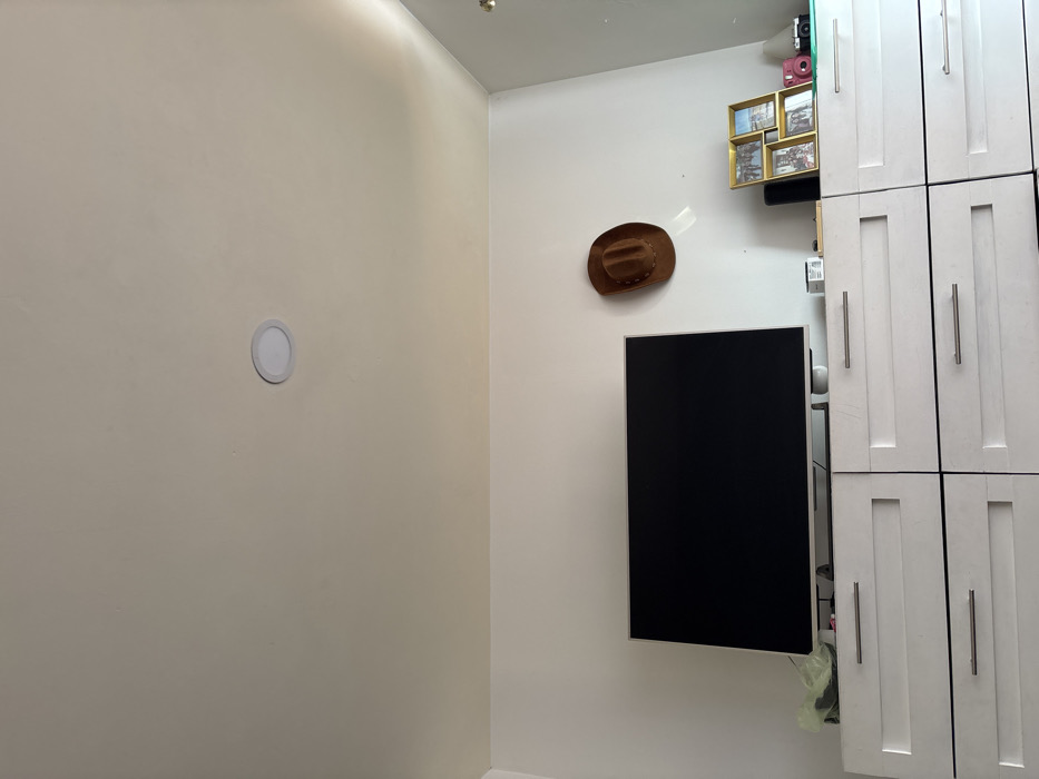 The scene depicts an interior room located in San Andrés Cholula, Mexico. The perspective is directed upwards, showcasing a light-colored ceiling with a single circular recessed light fixture. Below the ceiling, the upper two-thirds of a white wall are visible. A large, dark-screened flat-panel television is centrally positioned, resting on a white dresser. The television screen is off. To the right of the television, a brown cowboy hat with visible stitching is hung on the white wall. The white dresser below the television consists of two tiers of drawers with silver horizontal pull handles. The top tier features two narrower drawers on the left and right, while the bottom tier presents two wider drawers directly beneath them, creating a total of six visible drawers. On the dresser's surface, to the left of the television, a partially visible light green plastic bag or cloth is present. To the right of the television, various objects are arranged: a white cylindrical item, a small black rectangular device, a gold-colored multi-frame containing several photographs, a white conical object, a light pink instant camera, and a small light green rectangular object. No individuals are present in the image, and no active interactions are depicted.