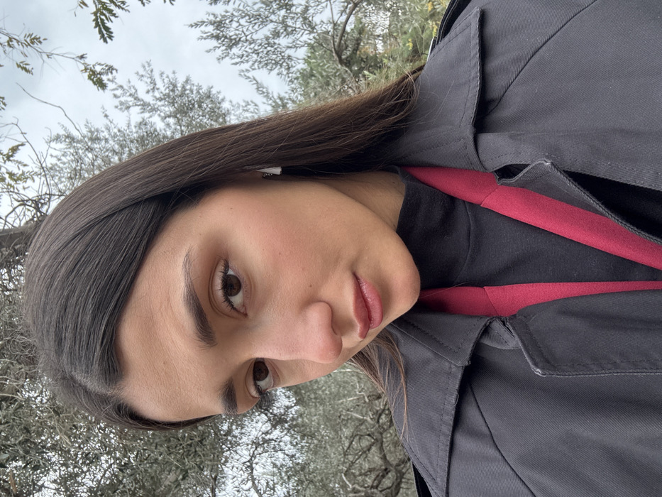 A female subject, appearing to be in her 20s or 30s, is depicted in a close-up portrait outdoors in Petrovac na Moru, Montenegro. She has long, dark brown hair parted down the center and brown eyes looking directly at the camera. Her lips are full and slightly parted, with a glossy finish. A small, white tassel earring is visible on her right ear. She is wearing a black collared jacket or trench coat over a black turtleneck shirt. A crimson strap or lanyard is visible around her neck, hanging over the black garment. The background consists of multiple trees with sparse, light grey-green foliage, consistent with olive trees, under an overcast, light grey sky. The lighting is natural and diffused.