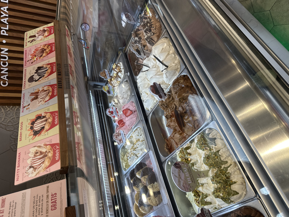 This is a display of ice cream at Aldo’s. Flavors include Nutty Banana, Berry Good, Aldo’s Classic, Cookie Overdose, Funky Rainbow, and What the Choc. Additional flavors visible in the freezer case are Dubai White Chocolate Pistachio and dark chocolate, along with fruity flavors. A sign promotes a reward program: collect 10 seals to get a free cone topping. The location is in Cancun, Playa.