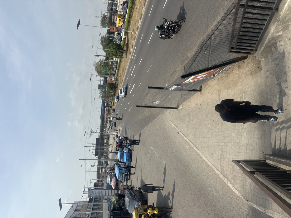 The image portrays a bustling urban street scene in Lagos, Nigeria, specifically located near the CMS Bus Stop, Marina, Lagos Island, with the elevated Lagos Blue Line railway viaduct prominent in the background. The environment is depicted under a clear, bright sky during daylight hours. In the immediate foreground, a male individual in a dark polo shirt, dark track pants, and sandals is observed from an elevated perspective, descending a concrete staircase fitted with a dark metal handrail. To the right of the stairs, a black mesh fence, partially covered with promotional posters, separates the pedestrian pathway from the main vehicular road. The midground to the left reveals a wide, paved area serving as a public transport and commercial zone. Approximately 20-30 pedestrians are visible, engaged in various activities such as walking, waiting, and conversing. Several light blue commercial passenger vans, locally known as Danfos, are parked or slowly moving within this area, indicating public transport operations. A dark minivan is also present. Adjacent to this area on the far left, commercial buildings with signage, including references to "GLOBAL BANK," "A&D," "SSA," and "MOTOR," line the street. Tall streetlights with solar panels are installed along this section. The main road, a multi-lane asphalt thoroughfare with distinct white lane markings, occupies the center and right midground. Vehicular traffic, including several white SUVs and sedans, is observed moving in both directions, primarily away from the camera. A motorcyclist wearing a green helmet and dark attire is riding a dark motorcycle equipped with saddlebags in the lane closest to the fence, heading away from the viewer. A landscaped median strip, containing sparse grass and small trees, separates opposing traffic flows. The background is dominated by a prominent, elevated concrete railway viaduct, characteristic of the Lagos Blue Line, traversing horizontally across the scene. Beyond this structure, additional urban buildings and infrastructure are discernible under a pale blue sky.