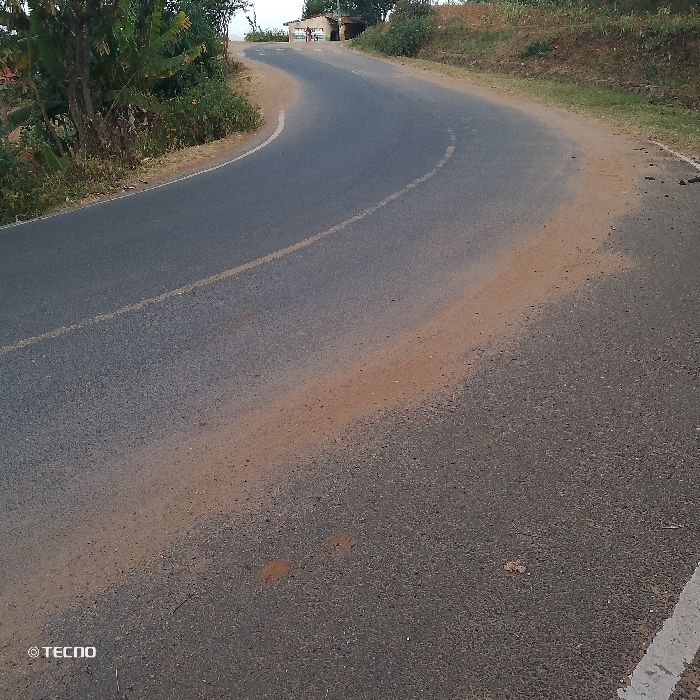 A winding asphalt road cuts through a lush landscape, marked with a central yellow line. Patches of dirt and debris encroach upon the road's surface near the edges, indicating potential runoff or weathering. Lush vegetation borders the road on one side, while a grassy slope rises on the other. A small building or structure is visible in the distance, perched at the road's farthest bend. The image captures a scene of rural road infrastructure.