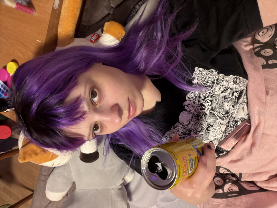 A person with purple hair holds an open can of yellow beverage. They wear a black t-shirt with a white print and lie on a pink blanket with a pattern of black and white circles. A gray and white stuffed animal is beside them. A cell phone is tucked into the blanket. The background includes a wooden surface and a tan stuffed animal with a "fancy" tag. The photo is taken from an overhead perspective, slightly rotated.