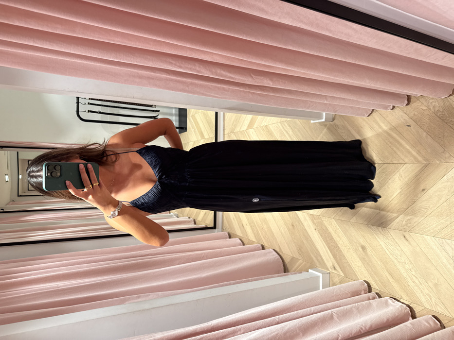 A person is depicted taking a mirrored selfie in a retail fitting room located in Las Rozas De Madrid, Spain. The individual, largely obscured by a dark green smartphone held at chest height with both hands, wears a long, dark blue sleeveless dress featuring spaghetti straps, a ruched V-neck bodice, and a small light-colored circular emblem on the left hip. A silver-toned watch or bracelet is visible on the left wrist, and a ring is on the right hand. The person's right hand rests on their hip. The fitting room features two floor-length, pleated light pink curtains framing the central mirror. The floor is light-toned wood parquet arranged in a herringbone pattern. The reflection in the mirror reveals a portion of a garment rack with dark hanging items to the right.