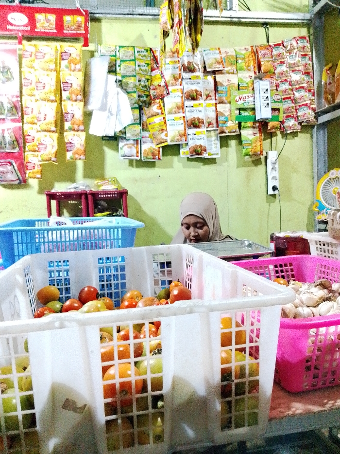 A small market or store is shown with various goods on display, including tomatoes in a white plastic basket, garlic in a pink basket, and instant food packets hanging on the wall. A woman wearing a hijab stands behind the counter. A blue plastic basket is visible near the tomatoes. The wall is painted a light green color, and electrical outlets are nearby.