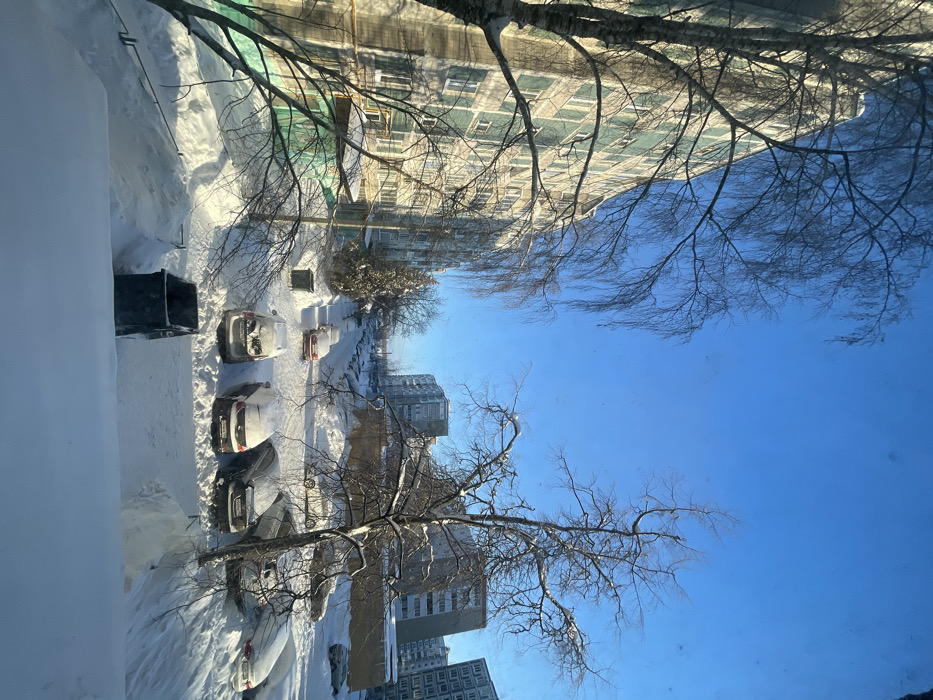 A snowy street scene viewed from a high vantage point. Cars parked on the side of the road are covered in snow. Tall buildings stand on either side, their architecture partially obscured by bare tree branches. The sky is a clear, bright blue. A large container is visible in the lower left of the frame.