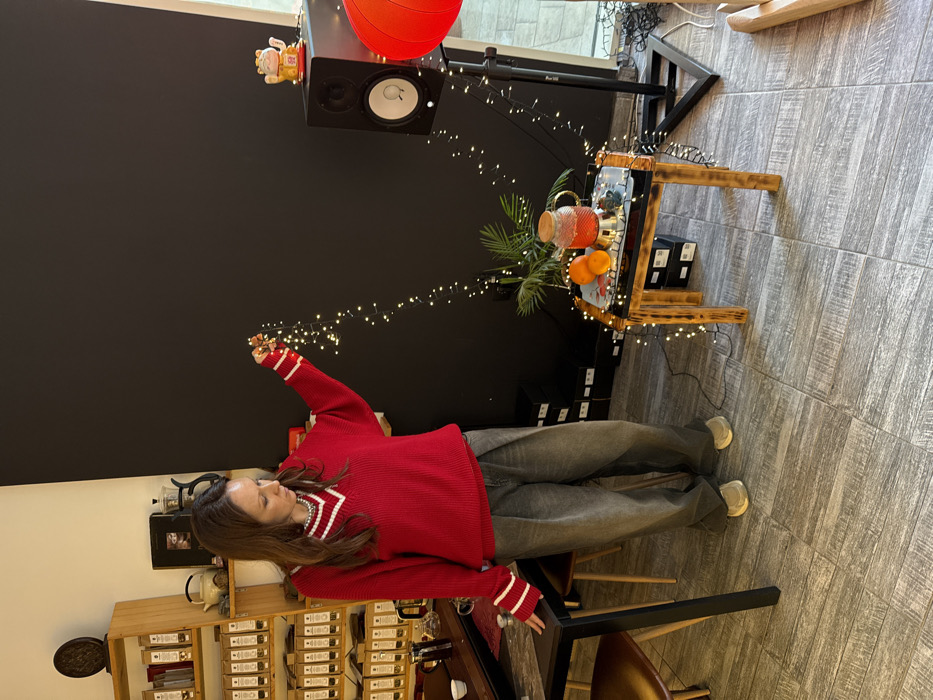 The scene is an interior commercial space located in Budva, Montenegro. One adult female stands in the center-left, facing downwards towards her right hand which holds a string of illuminated warm white LED lights. She wears a red V-neck sweater with white striped cuffs and collar, charcoal grey pleated wide-leg trousers, and light-colored flat shoes. To her left, a multi-tiered wooden shelving unit displays numerous small, upright containers, likely tea packages, alongside several ceramic teapots and cups. A dark, circular, relief-carved object rests on the topmost shelf. A dark-colored table with a black top and wooden legs is partially visible in the foreground on the left. The background consists of a dark gray wall. On the right side, a black Yamaha studio monitor speaker is mounted on a stand. A small white Maneki-neko figurine is positioned atop the speaker. Partially visible to the far right is a large red spherical lantern. In the mid-ground, a rustic wooden table with a dark glass top holds a clear glass teapot with a wooden lid, containing a reddish beverage, flanked by two tangerines on a patterned tray. A small green potted plant is situated behind the teapot. Several dark boxes are stacked on the floor behind this table. The floor is covered with grey-toned rectangular tiles exhibiting a wood-grain pattern. The string of lights held by the woman extends diagonally downwards towards the small wooden table.