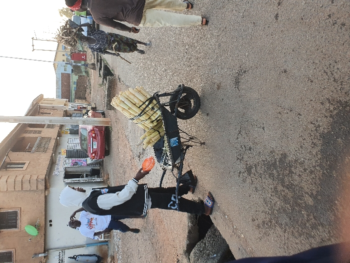 A person in a white hoodie and black track pants stands next to a cart loaded with sugar cane, holding an orange object. Another individual in a white t-shirt is standing nearby. In the background, a man carries bundles on his head. The setting appears to be a street lined with buildings, and a red car is parked in front of a shop.