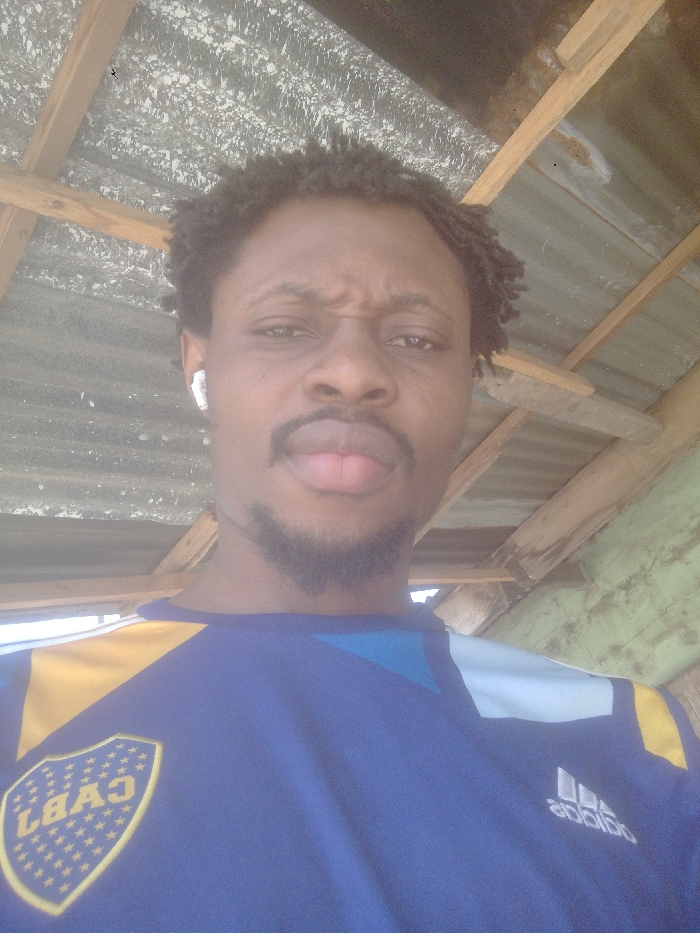 This image, taken in Zaria, Nigeria, depicts an adult male from the chest up, positioned indoors or under a shelter