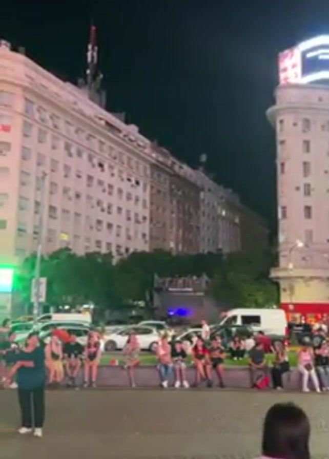 n urban scene at night with several people present. Most of the individuals are sitting on a low wall. Buildings rise in the background, with a large illuminated billboard on one. Cars are parked nearby and a white van is also visible. A person walks in the foreground of the shot and a light post with several boxes attached to it is seen on the left.