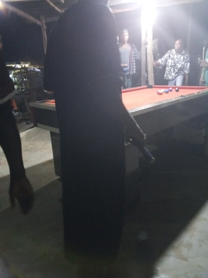 The image depicts an nighttime scene inside a semi-enclosed structure in Zango-ndaji, Nigeria, where at least four individuals are gathered around a pool table under bright artificial illumination