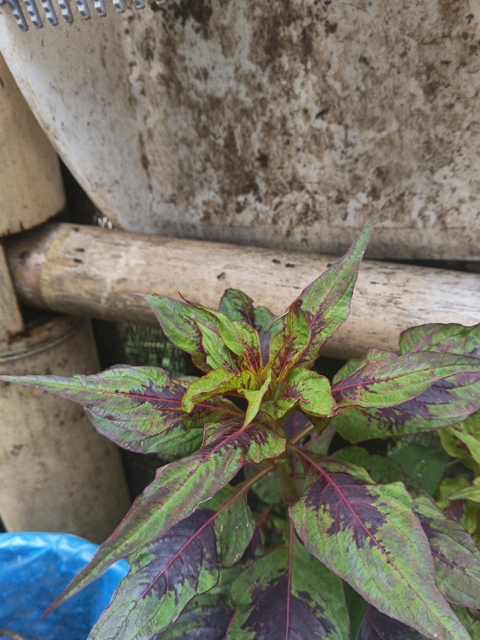 A vibrant plant with striking green and purple leaves is centered in the frame. The leaves are lance-shaped and textured with a prominent venation pattern in red. The plant is set against a backdrop of natural, rustic elements. In the upper portion, a weathered, light-colored object with dark stains is positioned above a piece of bamboo. To the left, a blue plastic bag and various objects are visible, adding depth and contrasting colors to the scene.