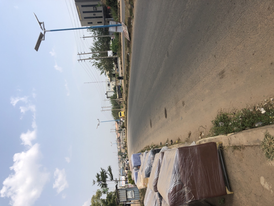 This image presents a daytime street scene in Oshogbo, Nigeria, under a light blue sky with scattered white cumulus clouds. In the immediate foreground on the left, approximately ten new, upholstered furniture pieces, appearing to be sofas or armchairs, are displayed in a linear arrangement on a dirt shoulder. Each item is individually wrapped in clear plastic film, revealing brown/burgundy and blue upholstery. A concrete curb separates this dirt shoulder from the road. Adjacent to the furniture, a small, light-colored kiosk-like structure is partially visible, adorned with multiple flags on poles, one of which resembles the Nigerian national flag. A sign reading "BIG GRACE" is affixed to this structure. The central feature is a two-lane asphalt road, which recedes into the distance and curves gently to the left. The road surface exhibits signs of wear, including dark stains and minor patching. On the right side of the road, a dirt median or shoulder parallels the asphalt, sparsely vegetated with green plants and scattered debris. A prominent blue and white pole supporting a solar-powered street light stands in the mid-ground on this median, with a second similar street light visible further down the road. Overhead utility poles with multiple power lines run along the far side of the road. In the background, various buildings are visible. Notably, a multi-story building on the right bears the text "CHURCH OF GOD GLOBAL HOLDINGS" on its facade. Further down the road, a yellow vehicle (possibly a bus or minivan) and a motorcycle are discernible. Distant terrain or structures are faintly visible against the horizon. No individuals are clearly identifiable in the immediate foreground or mid-ground.