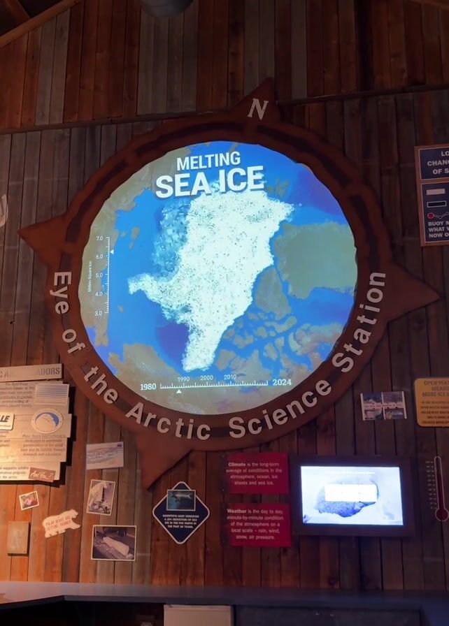 person walking in front of a wall display with the title "Melting Sea Ice: Eye of the Arctic Science Station"
