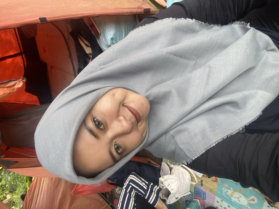 A person wearing a gray hijab smiles at the camera. They are inside a tent, evident by the orange fabric and support structure visible in the background. The person wears a dark long-sleeved shirt. A red plastic bag and blue striped clothing are seen in the lower part of the frame near the person. A white purse sits on a patterned mat or floor cover.