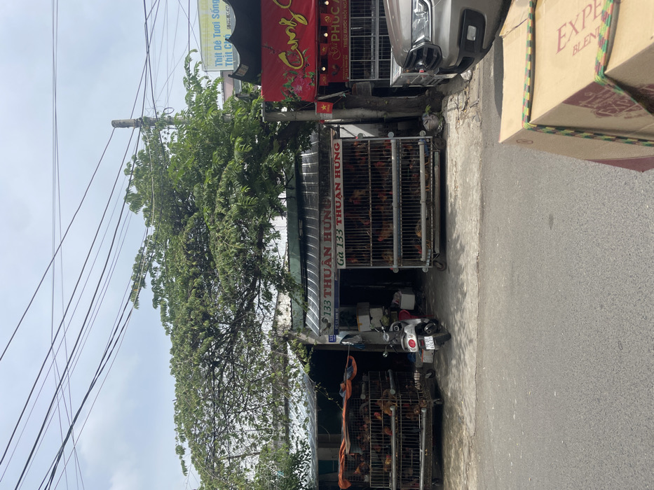 A street scene shows a business called "THUÂN HƯNG" at 133 Ga, selling live chickens in cages along the sidewalk