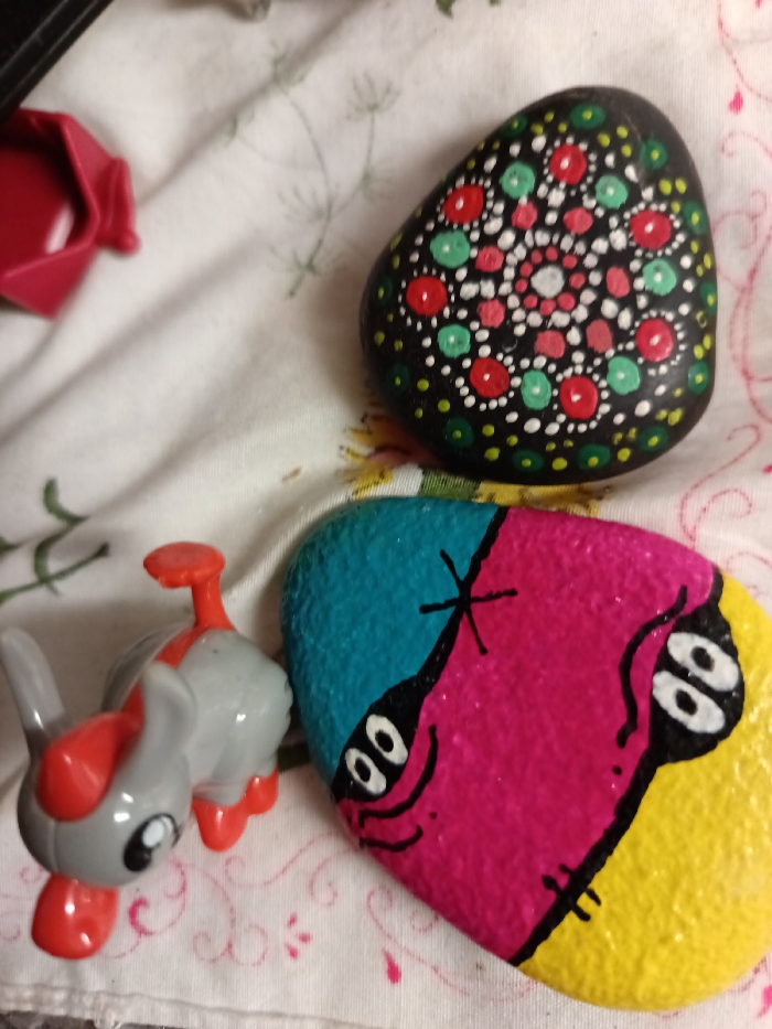 The image displays a close-up, overhead view of several items arranged on a white fabric surface. The fabric exhibits faint, light green botanical patterns and subtle pinkish markings. The scene is situated in Leipzig, Germany. Two painted rocks are prominent. The first, positioned towards the top right, is an approximately oval-shaped black rock. It features a detailed, mandala-style dot pattern composed of concentric circles of red, white, light green, and yellow dots. The second rock, larger and located below the first, is also roughly oval and painted with three distinct, solid color sections: bright teal on the left, hot pink in the center, and bright yellow on the right. This rock is adorned with a stylized, cartoon-like face, including two white oval eyes with black pupils, a black smiling line, and additional black markings that resemble stitches or hair. To the left of the colorful rock, a small plastic toy figure is present. This figure is primarily grey with red components, including its head, feet, and a small, raised circular piece on its back, consistent with a stylized rhinoceros. A partially visible, crumpled or folded red plastic or silicone object is visible in the upper left corner of the frame.