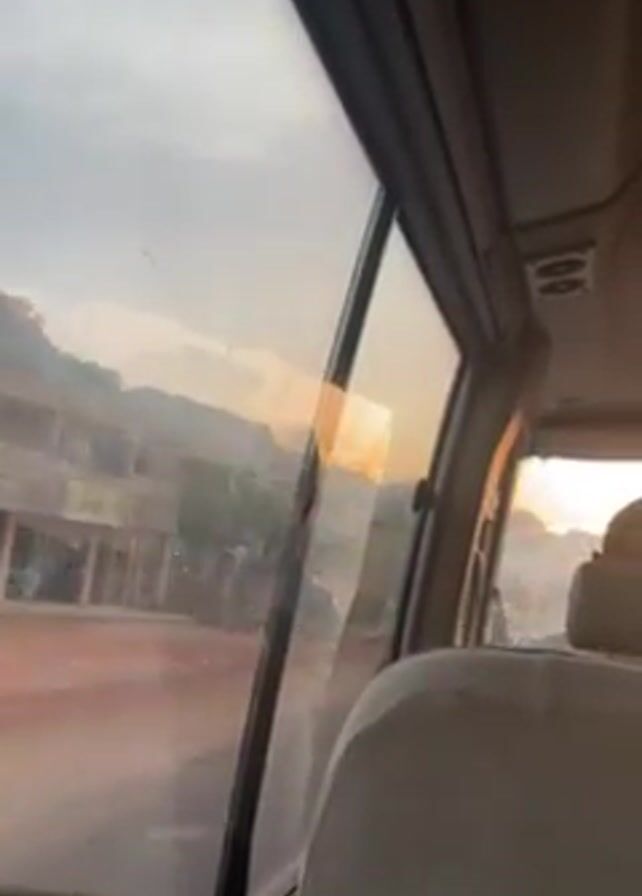 The view from inside a moving vehicle, likely a bus or van, shows a streetscape through the window. The vehicle's interior has gray seats and trim. The exterior view captures a street with buildings and structures. The sky is overcast, possibly at dawn or dusk. The buildings appear to be a mix of residential and commercial structures, some with corrugated metal roofs. The video is taken from a passenger's perspective.
