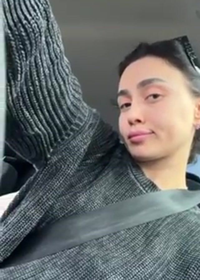 A woman is in the driver's seat of a car, wearing a gray sweater and a seatbelt. She has dark hair pulled back and is looking at the camera while lip-syncing to music. Her right arm is raised, revealing a tattoo on her forearm. The car interior is visible, including the steering wheel and dashboard. The sky is visible through the windshield.