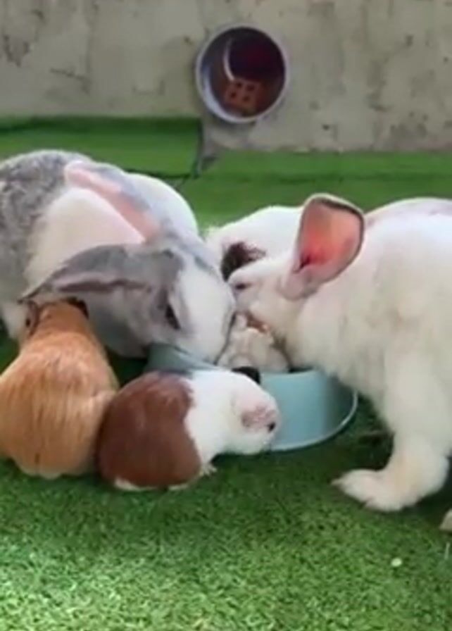 group of animals eating together. There are three rabbits, one predominantly white with pink ears and one white and gray, clustered around a blue bowl, eating. Two guinea pigs, one tan and the other brown and white, are nearby, with the brown and white one also attempting to eat from the bowl. All the animals are on green artificial turf. Behind them is a concrete-like wall with a reflective object hanging on it. The rabbits are actively eating from the bowl while the guinea pigs are mostly observing, with one venturing to the edge of the bowl.