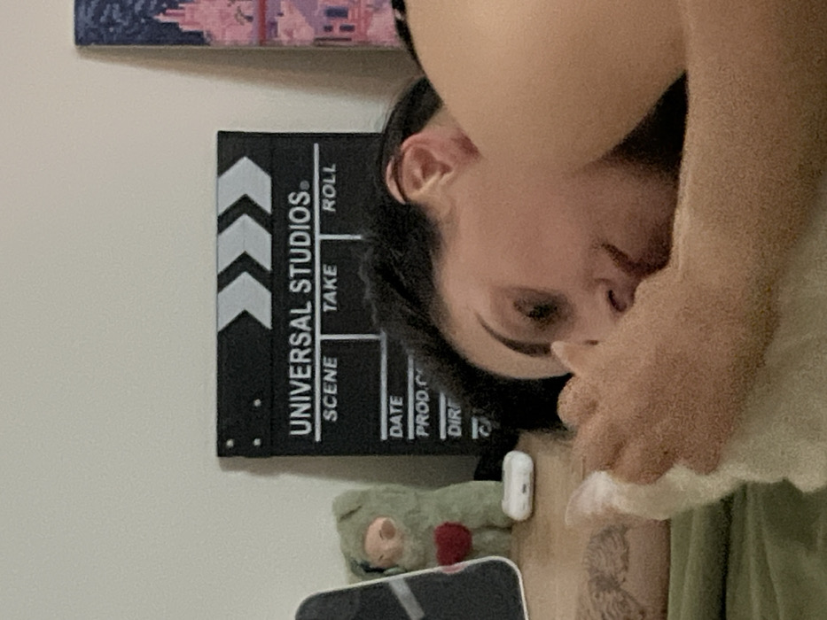 A woman is partially visible with her face in view, positioned to the right of a Universal Studios clapboard. Her hand obscures part of her face, holding a white cloth. A tattoo is visible on her chest. A green, plush, character with a red dot on its chest and a white rectangular object are near a partially seen smartphone. An abstract wall art piece is situated in the top left corner.