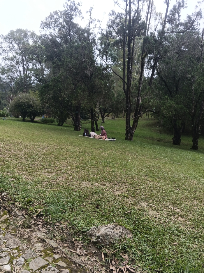 The scene is set outdoors in a verdant, tree-filled landscape, identified as being in Tây Ninh, Vietnam. The sky is overcast, providing diffuse lighting. In the mid-ground, two individuals are present on a patch of green grass. One person is lying prone on a light-colored mat. Behind them, a second person is seated upright, dressed in a reddish-brown top and dark pants, with their hands positioned on the back or shoulder area of the prone individual, suggesting an act of care or massage. A dark backpack rests next to the seated person on the mat, and two small dark objects (possibly shoes) are visible on the mat to the right of the prone person. The immediate foreground features sparse grass and a partial view of a cobbled pathway. The surrounding environment consists of numerous tall, slender trees and dense shrubbery, with a distant, faint mountain range visible on the far left horizon. The ground is primarily covered in green grass with some drier patches.